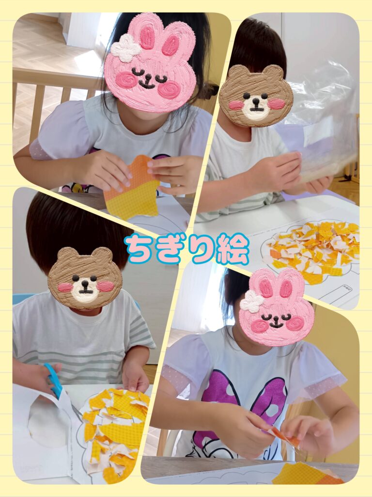 ãªã¬ã³ãžè²ãšé»è²ã®çŽãæå ã䜿ã£ãŠå°ããåã£ãŠãã«ããã£ã®çµµã«åãããŠè²Œã£ãŠãããŸããåãã¯ãªããªãåããã硬ããŠåããªãðŠããšé£ãããã«ããå§¿ãèŠãããŸããããçŽãæã€äœçœ®ãæã¡æ¹ãæå ã®åããæ¹ãäŒãããšããã£ãããšããªããªç ŽããŠããæ§åãã»ã»ã»ïŒðâš