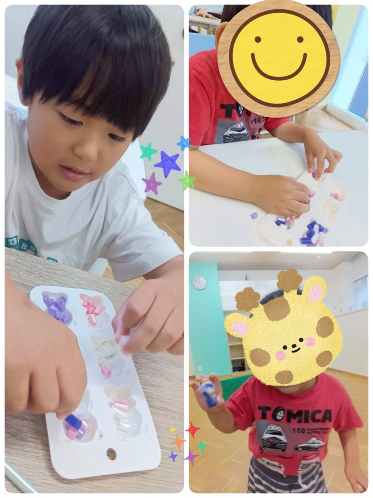 紫やピンク等様々な色のグルーガンを見て、ぱぁっと表情が明るくなる子どもたち😊