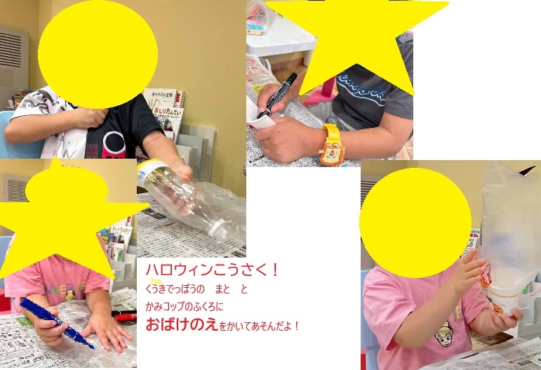 また、空気でっぽうの方は、紙コップに個性豊かなおばけを描いたり、またさっさとおばけを描いて済ませてしまう児童もいて、それぞれ個性を出しながら描き楽しんでいました。