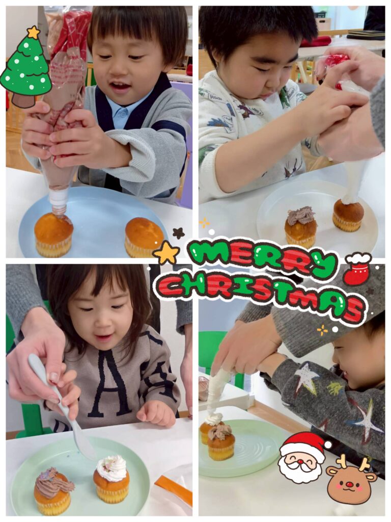 「サンタさんに〇〇もらった~」「今日はお家でパーティーだからチキンをたべる~」などと嬉しそうにお話してくれるお子さまたち😊