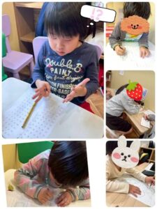 スプーンにフェルトが2個乗って移し替えに成功すると、にっこりと笑っていた姿が見られましたよ💖