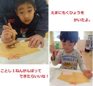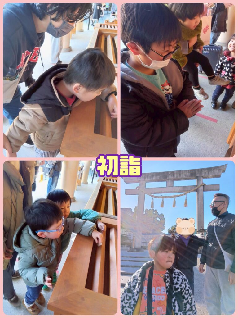 初詣前に、初詣に行くのは1年間元気に過ごすことが出来るように神様にお願いする為というや参拝の作法(二礼二拍手一礼)について職員が子どもたちに話すと、しっかりと聞いていた子どもたち😊