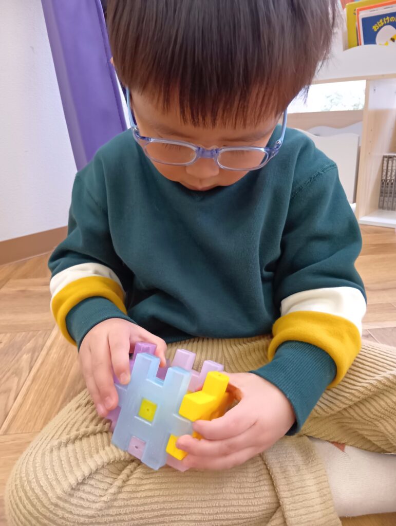 初めは大きいブロックの付け外しから始め小さな“出来た”を積み重ねていくことで、スプーンや鉛筆、お箸といった難しいことも出来るように支援していきます😎