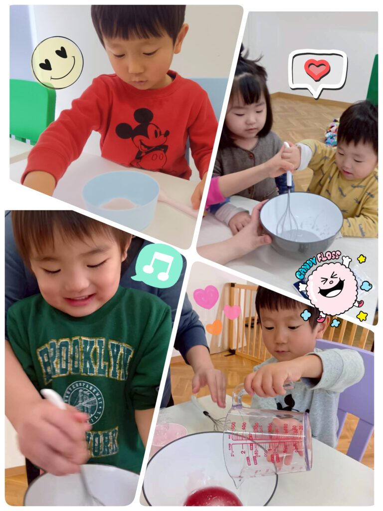 また違う粉を入れる際は、「どんな色になるのかなー?」とわくわくな表情をしながら作る姿が見られました💕