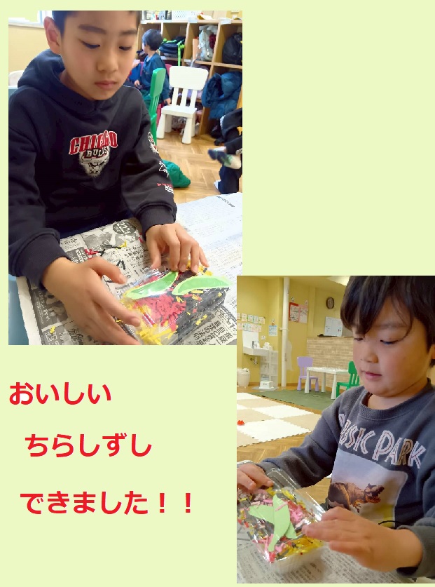 どの子どもたちもパラパラとかけるだけだったので、楽しく自分なりの色具合を出しながらちらしずしの感じを出していました😀