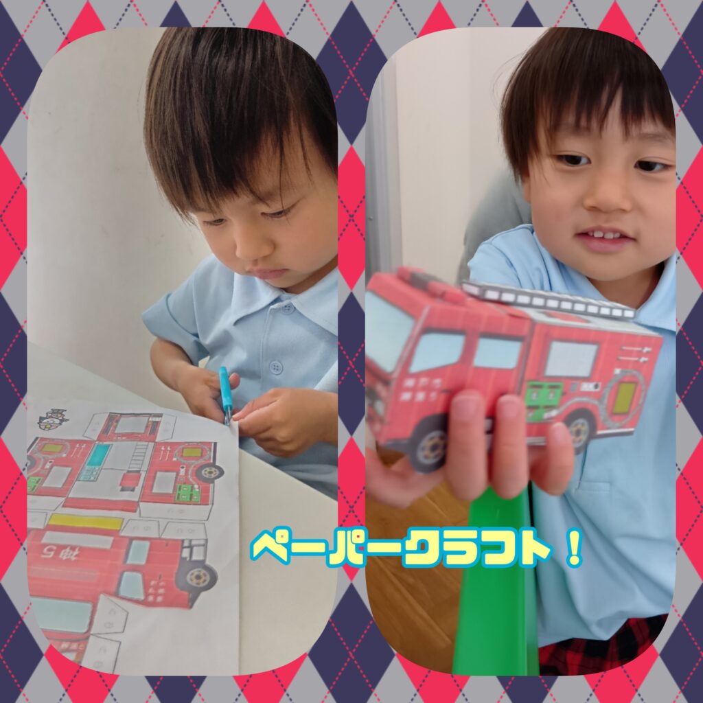 糊代があり少し切り方が難しい場面もありましたが、職員と一緒に協力しながらはさみできり進める姿があり、すべて切り終わり糊で貼りつけて完成した消防車を見ると“出来た〜!”と嬉しそうにしていましたよ♪